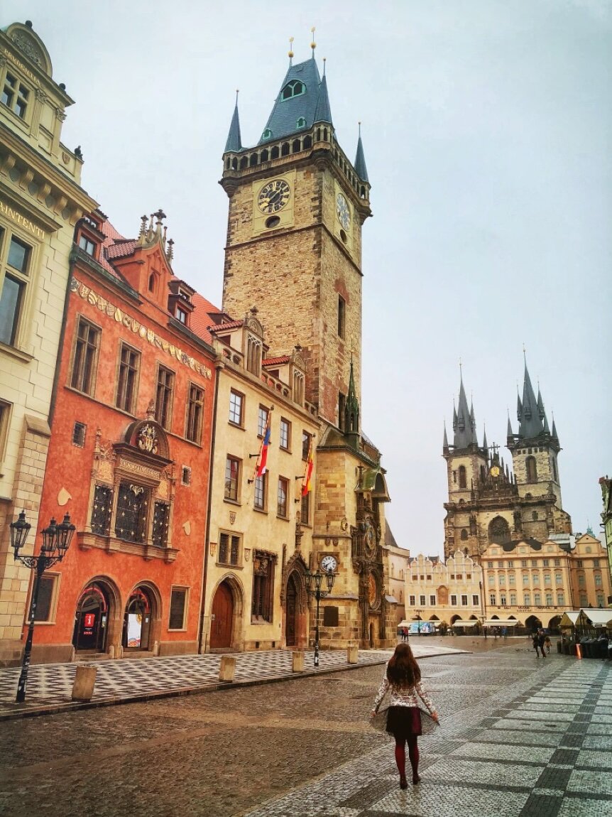 Item2, Link to Larger Image, Woman walking on cobblestone street with clock tower